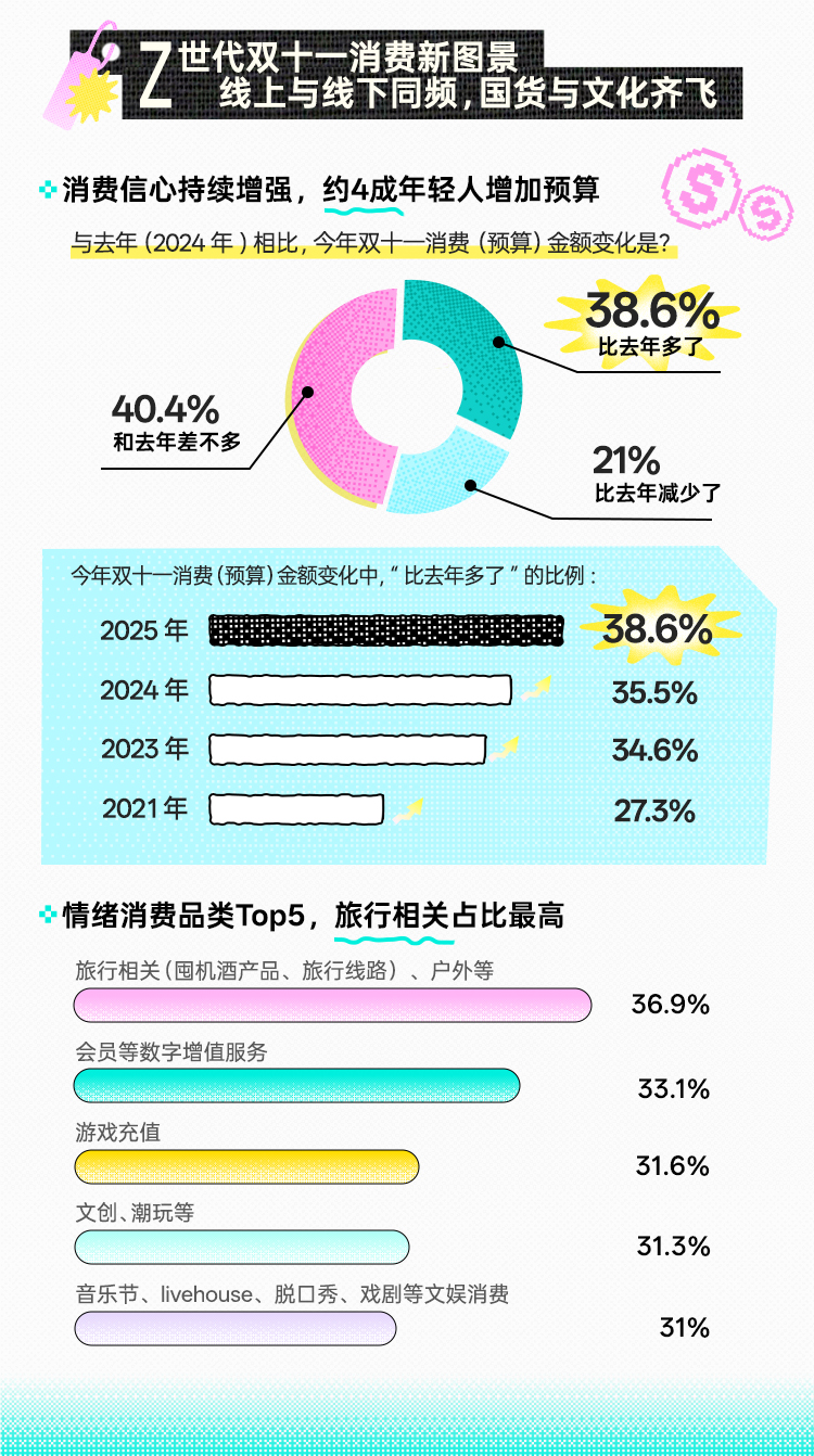 数据显示,消费预算变化与去年相比,近4成被调查青年表示“比去年多了”(38.6%),北上广深青年这一趋势更显著、该比例达45.15%;增加预算与维持预算的群体合计占比近8成。“双11”预算消费金额的年度变化中,“比去年多了”的比例由2021年的27.3%上升至2025年的38.6%。