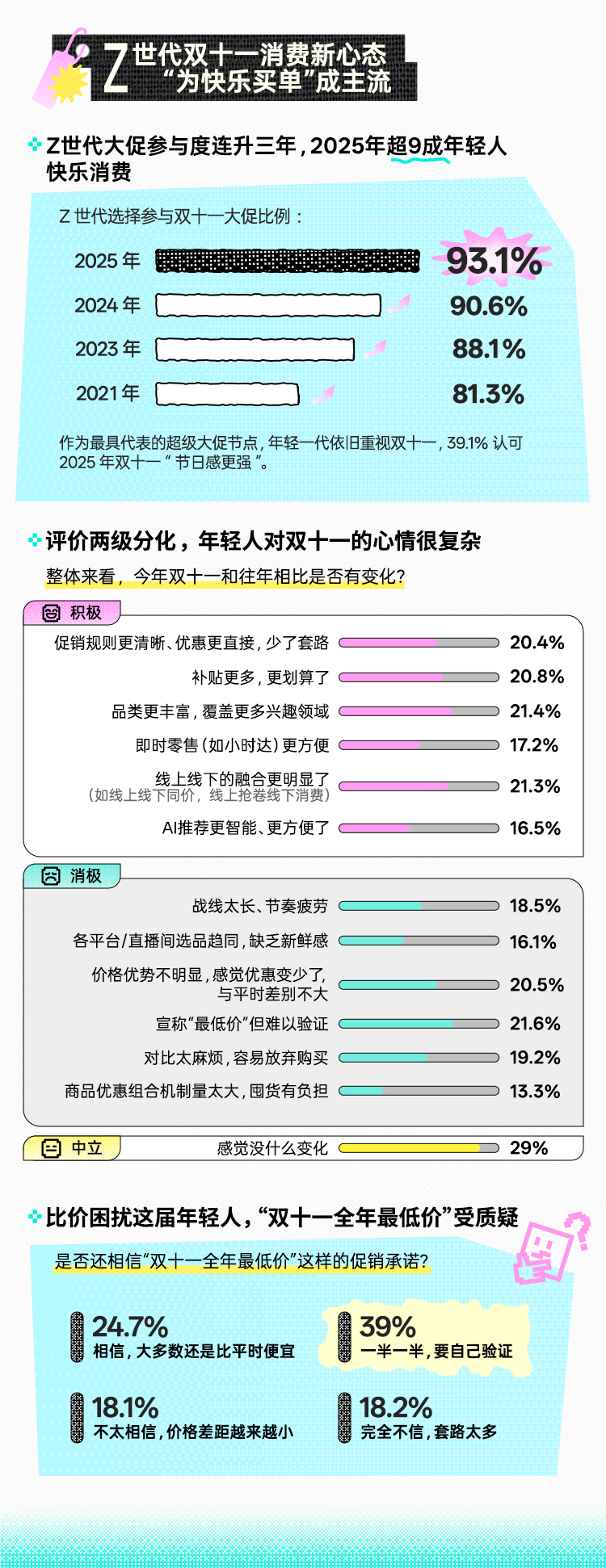 11月7日,Just So Soul研究院联合上海市青少年研究中心发布的《2025 Z世代双十一消费行为报告》显示,Z世代大促参与度连续三年提升,在受访的近2800名年轻人中,超9成参与双11购物,约4成年轻人在今年增加了预算。